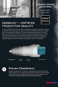 We support our business partners with outstanding manufacturing know-how and material expertise to address the challenge between design work and serial production. The brand DENSILOX® stands for expertise in ceramics and quality high-volume manufacturing with flexible production routes. Carefully monitored production and quality control are the key factors to meet the highest standards of quality and batch consistency of our products. All customized ceramic implant solutions produced in our facilities in Germany are certified with the 2024 CleanImplant supplier label.