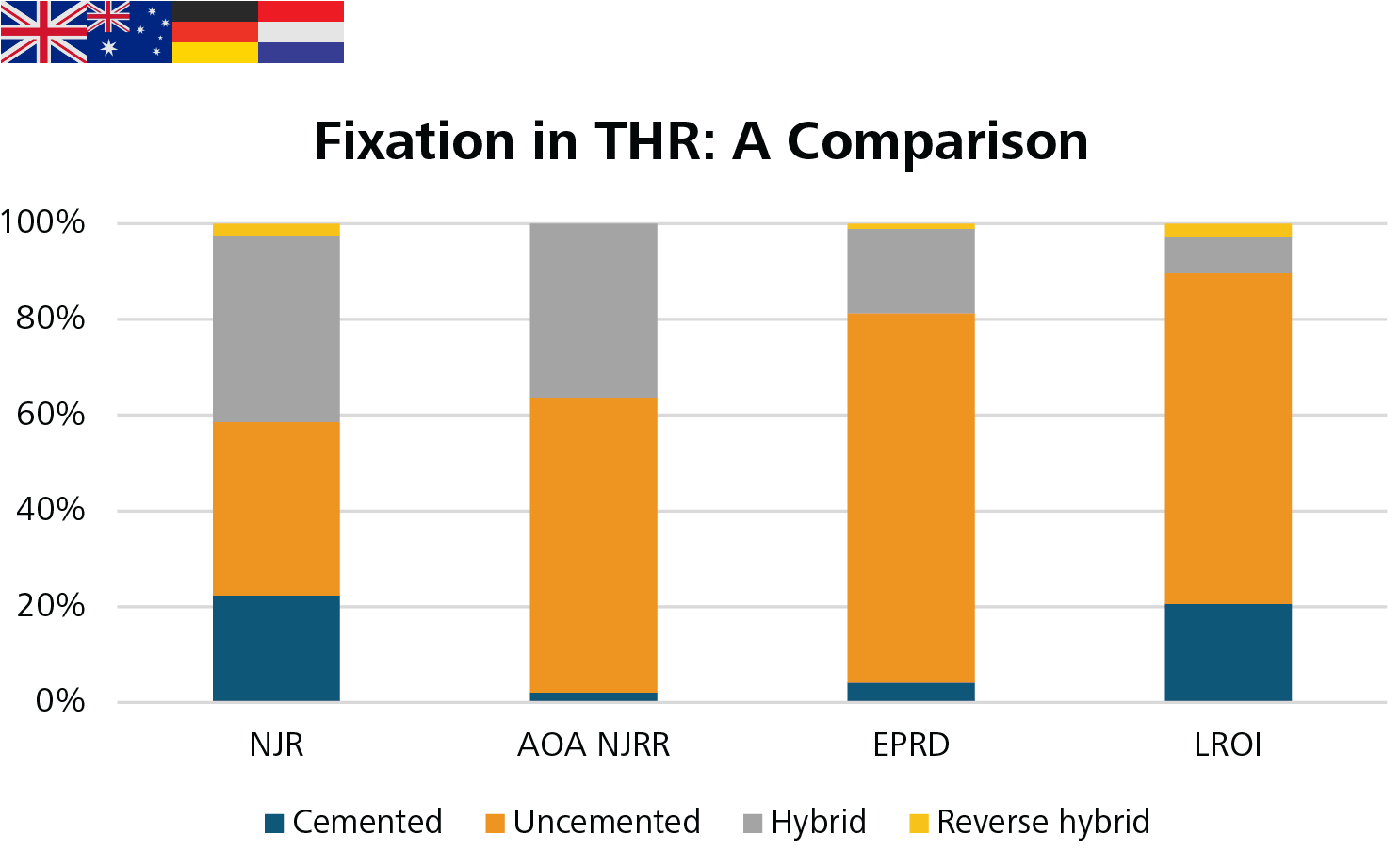 Uncemented fixation remains the most often used method in Australia, Germany, United States, New Zealand, and the Netherlands. The use of cemented fixation has decreased year on year in Sweden but still accounts for 52% of all THR procedures.