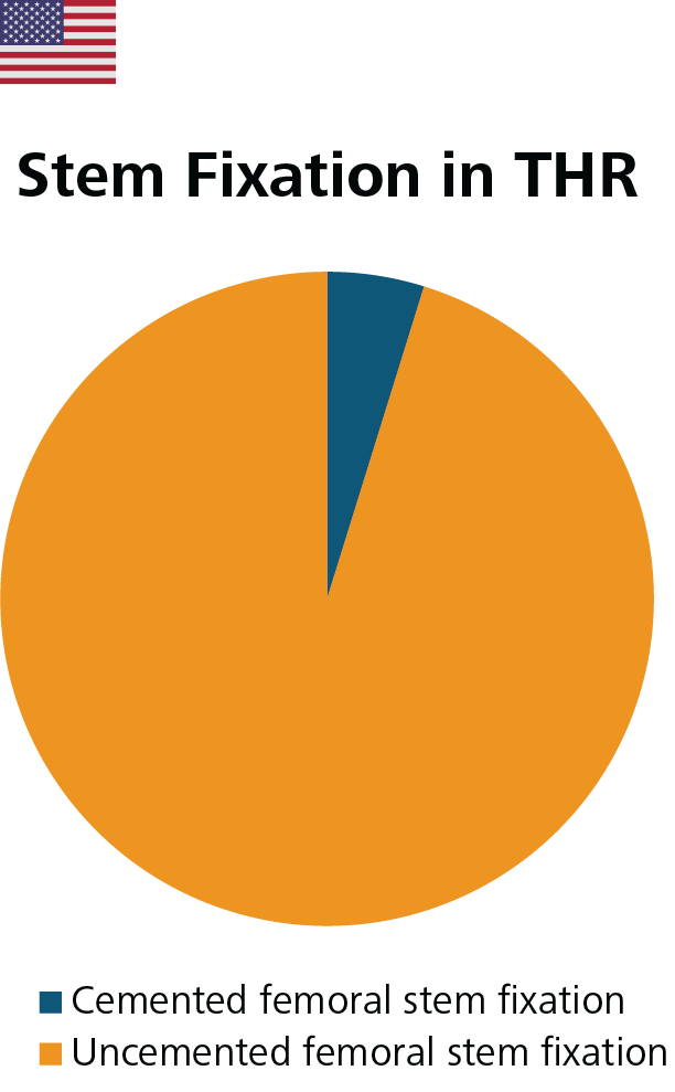 In the United States, uncemented femoral stem fixation remains the preferred option. According to the statistical data for operation year 2021, it was used in 95.2% of all elective primary THR procedures from 2012 to 2021. The highest use, so far, of cemented femoral stems was recorded at 4.8% in 2021 by AJRR.4