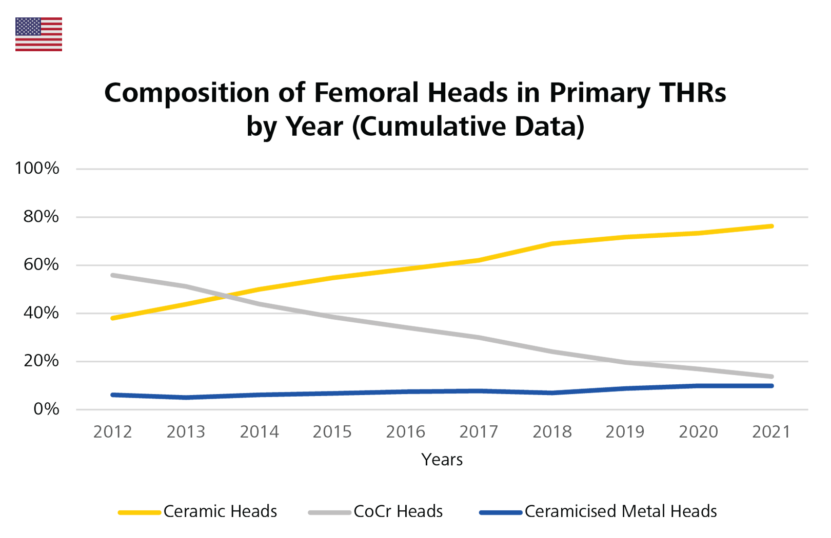 Figure 5: Composition of femoral heads in primary THR by year (cumulative data) in the United States.
