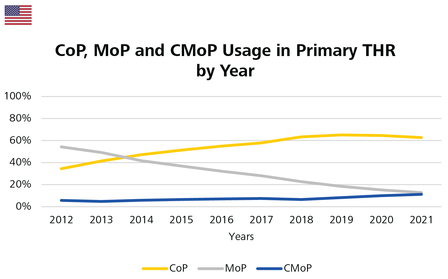 Figure 9: Usage of CoP, MoP and CMoP in primary THR by year in the United States.