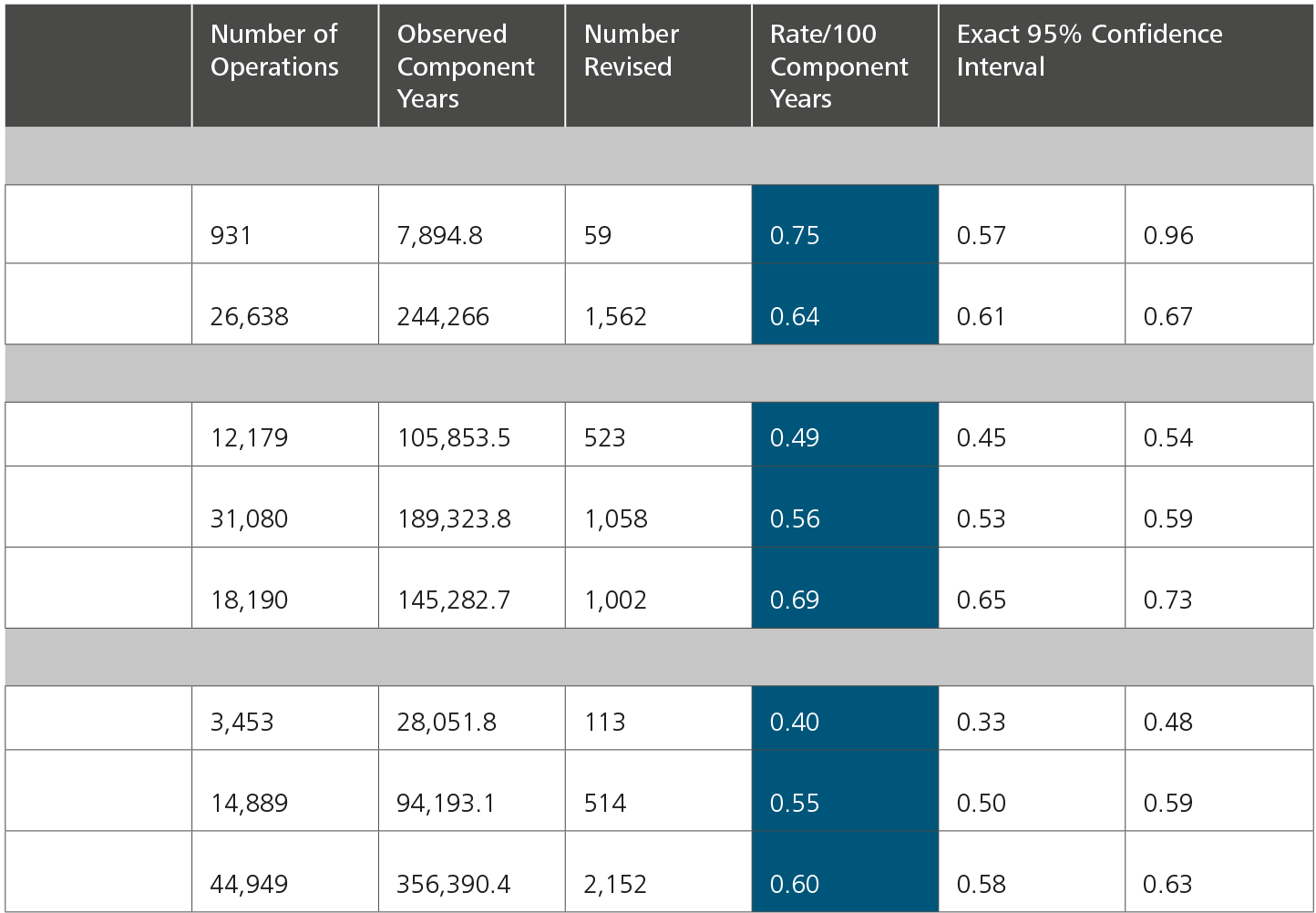 Rate/100 component years: equivalent to the yearly revision rate expressed as a percentage figure derived by dividing the number of prostheses revised by the observed component years multiplied by 100.