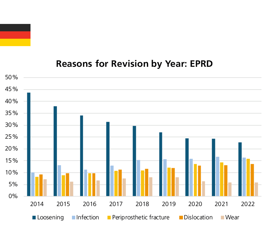 EPRD still provides data on reasons for revision based on procedures performed in the operation year. In 2022, loosening (22.7%), infection (16.4%), periprosthetic fracture (15.9%), dislocation (13.6%), and implant wear (5.8%) were the most common reasons for revision. Revision rates for loosening decreased each year, from 43.7% in 2014 to 22.7% in 2022. In contrast, revision rates due to infection increased from 10.1% in 2014 to 16.4% in 2022.3