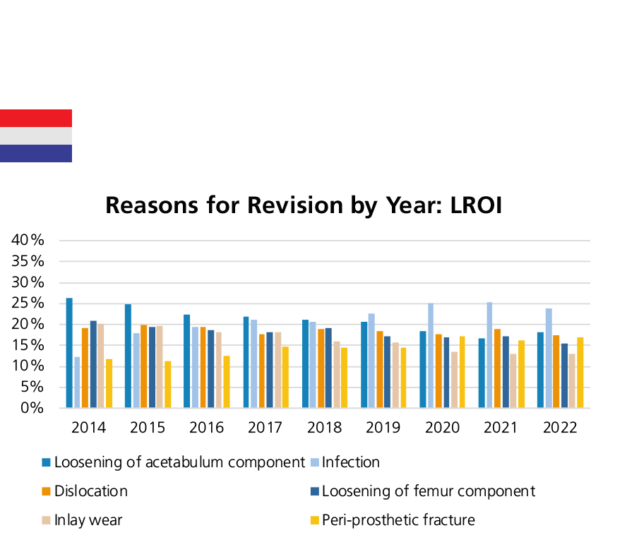 The most common reasons for revision recorded by LROI of all revision procedures between 2014 and 2022 were loosening of acetabulum component (21.2%), infection (20.9%), dislocation (18.6%), loosening of femur component (18.2%), and inlay wear (16.5%). The annual revision for infection increased from 12.3% in 2014 to 23.9% in 2022.7