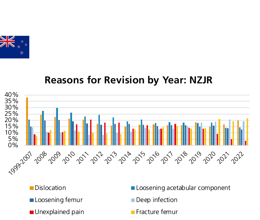 In Annual Report 2023, EPRD shows the following developments in the percentage shares of various treatment characteristics in primary THRs from 2012/13 to 2022, such as: fixation, insert materials, head sizes, head neck length as well as reasons for revision. As shown in the EPRD, revision rate due to loosening is decreasing each year. The revisions due to infection increased from 10.1% in 2014 to 16.4% in 2022. Similarly, the revision rates due to infections documented by the AJRR varies from 10.9% to 22.6% between 2012 and 2020, and then stabilized at about 23% in 2021 and 2022 (AJRR Annual Report 2023 Page 58 Figure 2.35). In the Netherlands, the annual revision for infection increased from 12.3% in 2014 to 25.3% in 2021 and then declined slightly to 23.9% in 2022. The NZJR has also provided insight into the year-on-year trends of their six main reasons for revision. The revision rate due to deep infection increased from 8.6% in 2012 to 19.3% in 2022. The revision rate due to fracture femur has steadily increased from 9.3% in 2013 to 21.5% in 2022. On the other hand, the revision rate due to unexplained pain declined from a peak of 20.6% in 2011 to 9.4% in 2020, then to the lowest point recorded in the registry in almost a decade, namely 3.6% in 2022.