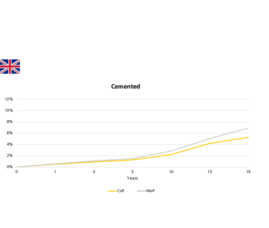 In the uncemented fixation group, there is a clear correlation between the revision rates of CoC bearings and head size: the larger the head, the lower the revision rate of the construct (except for 44mm heads after six years). In the hybrid fixation group, the revision rate of CoC bearings with 36mm heads was higher than that of 32- and 28mm heads (p=0.001).This annual report indicates that the early failure rate of MoPoM in uncemented and hybrid group were higher than most bearings. At this point, CoPoM performs better but with a small number.