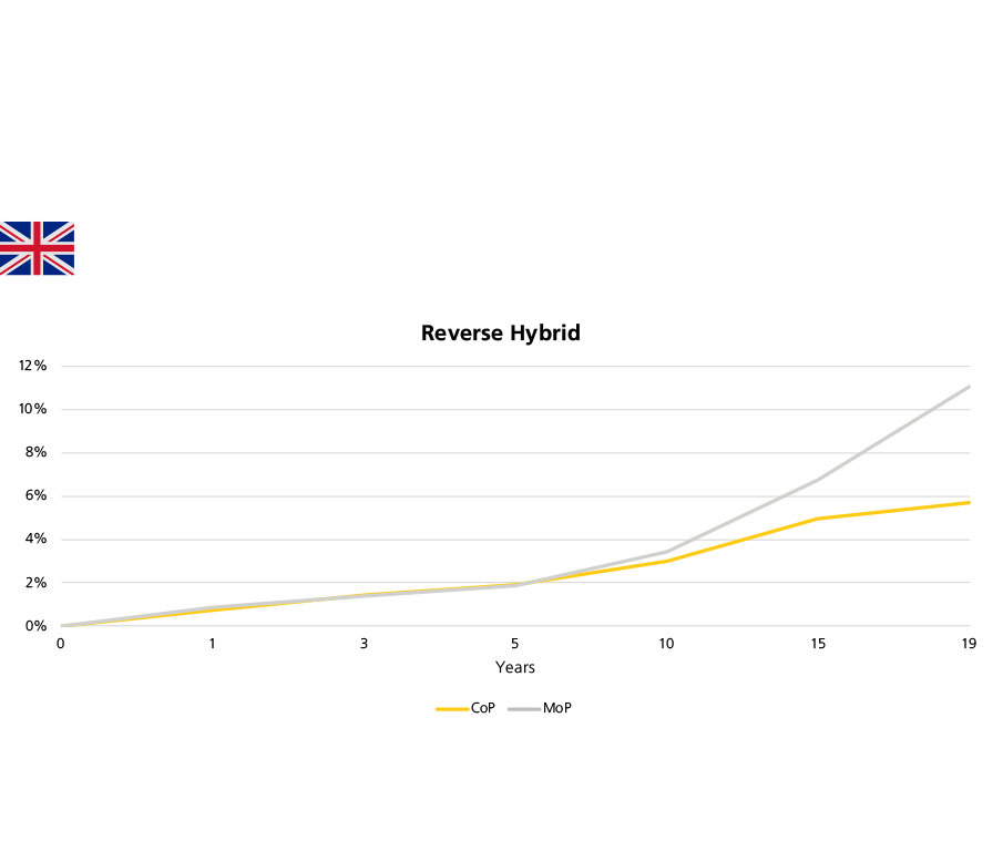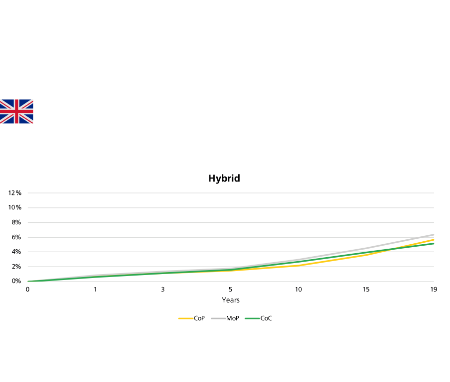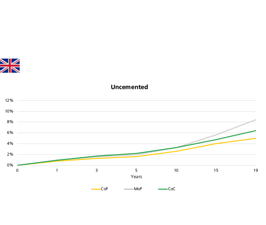 Figure 16: Cumulative revision rates in primary hip replacement with Mop, CoP, and CoC bearings in combination with different fixation methods in England, Wales, Northern Ireland, the Isle of Man and Guernsey.