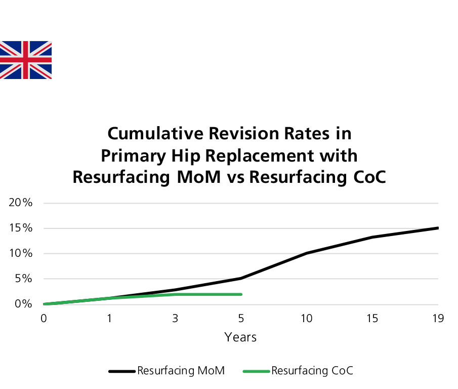 CoC resurfacing is recorded by the NJR for the first time in 2022, although this construct is still undertaken in small numbers (N=249). The early revision rate at 1 year for CoC resurfacing is similar to that for MoM resurfacing (1.27% (0.41%-3.87%) vs. 1.18% (1.08%-1.29%)), and lower at 3 years (1.91% (0.71%-5.11%) vs. 2.90 (2.74%-3.06%)) and 5 years (1.91% (0.71%-5.11%) vs. 5.06% (4.85%-5.28%)). The NJR reminds readers to be cautious in interpreting this difference due to the small number of CoC resurfacing.