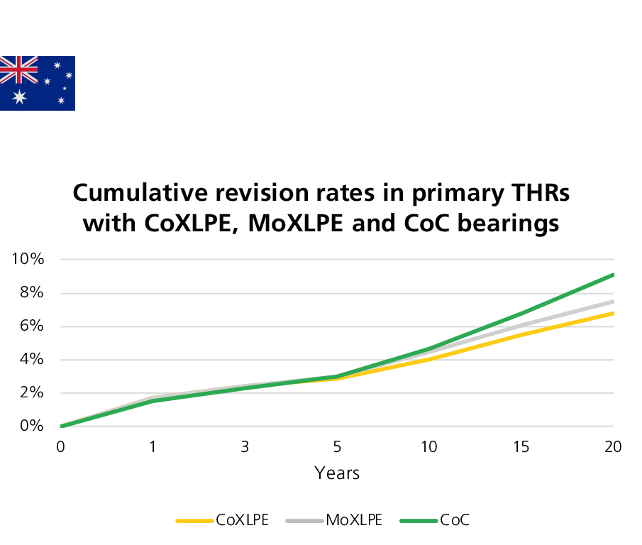 Figure 17: Cumulative revision rates in primary THR with CoXLPE, MoXLPE and CoC bearings (Primary Diagnosis OA) in Australia.
