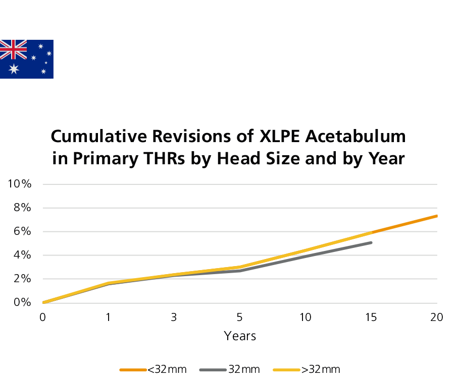 When comparing revision rate of different head size groups, in general, 32mm head size had a lower revision rate compared to the other head sizes.5