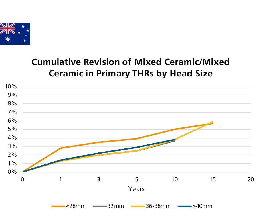 Figure 19: Cumulative revision of mixed ceramic/mixed ceramic bearings (Primary Diagnosis OA, restricted to modern prostheses) by head size in Australia.