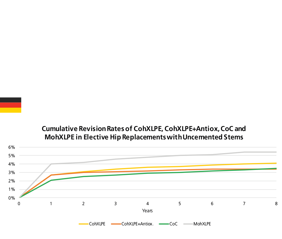 Figure 20: Cumulative revision rates of CohXLPE, CohXLPE+Antiox, MohXLPE and CoC in elective hip replacement by stem fixation in Germany.