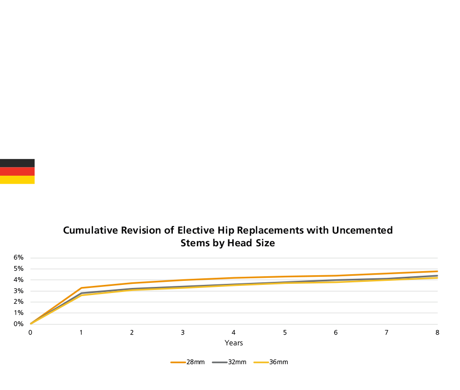 Figure 22: Cumulative revision rates of head size in elective hip replacement with different fixations in Germany.