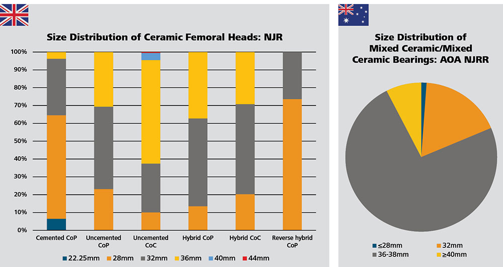 There is a trend towards 32mm femoral heads according to the considered European registries and NZJR, whereas the AOA NJRR and AJRR report a larger usage of the 36mm bearings.