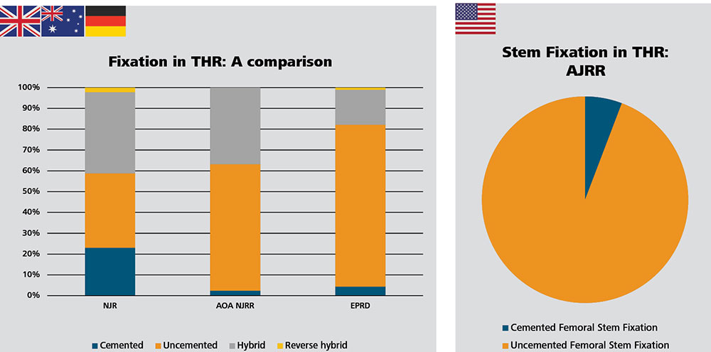 Despite some distinct differences among countries, there is a continuing overall trend toward uncemented and especially hybrid fixation at the expense of the all-cemented procedures. Larger head sizes and dual mobility constructs are also gaining in popularity. Ceramic femoral heads more and more supplant metal femoral heads.