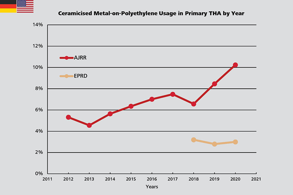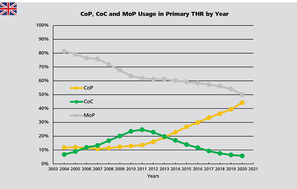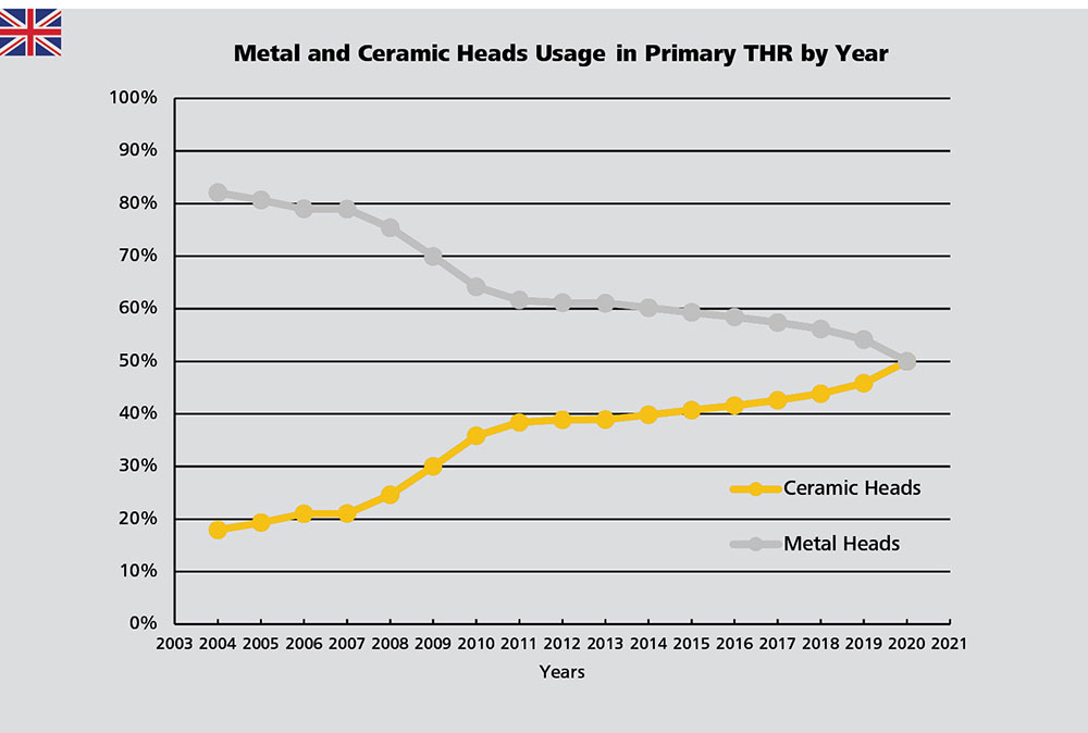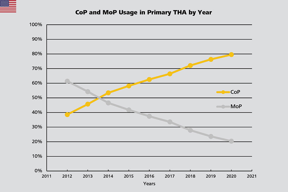 In the USA, the use of CMoP has nearly doubled between 2012 and 2020 from 5.3% to 10.2%.4 No significant change was recorded in Germany where approximately 3% of primary THRs are performed with CMoP femoral heads since 2018.3,17,18 The NZJR5, the SAR6 and the NJR1 do not include CMoP bearings in their annual reports. However, a study analyzing the British dataset shows that 9,237 CMoP bearings with an uncemented acetabular component were used between January 1, 2004, and July 28, 2016.19