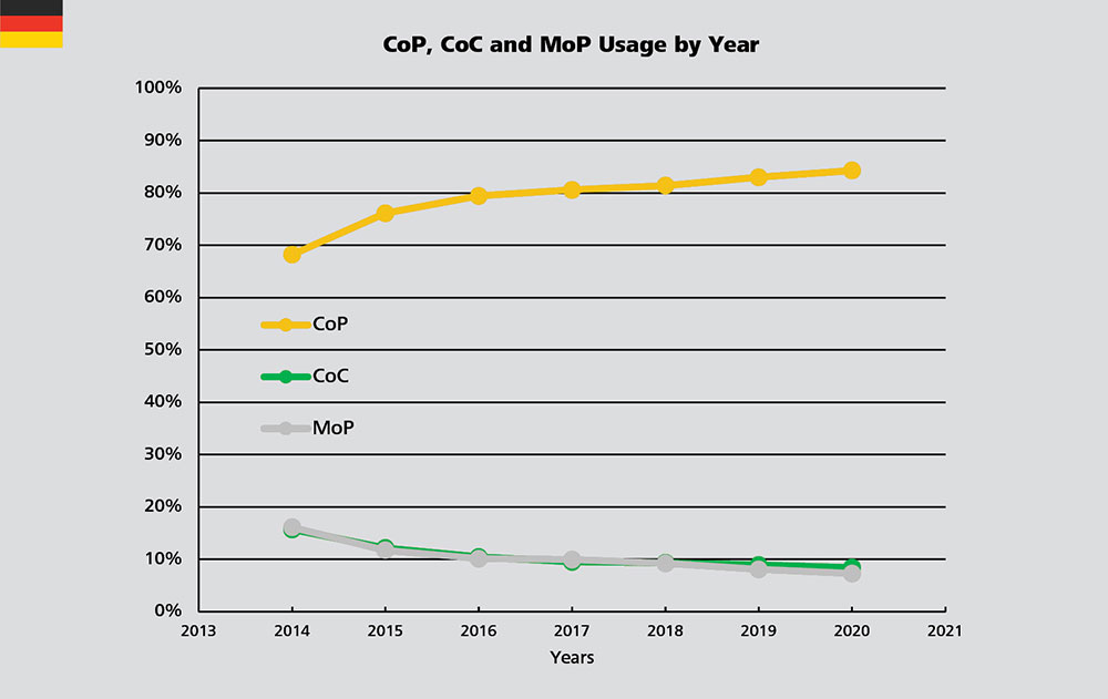 Figure 7: Usage of CoP, CoC and MoP by year in Germany.