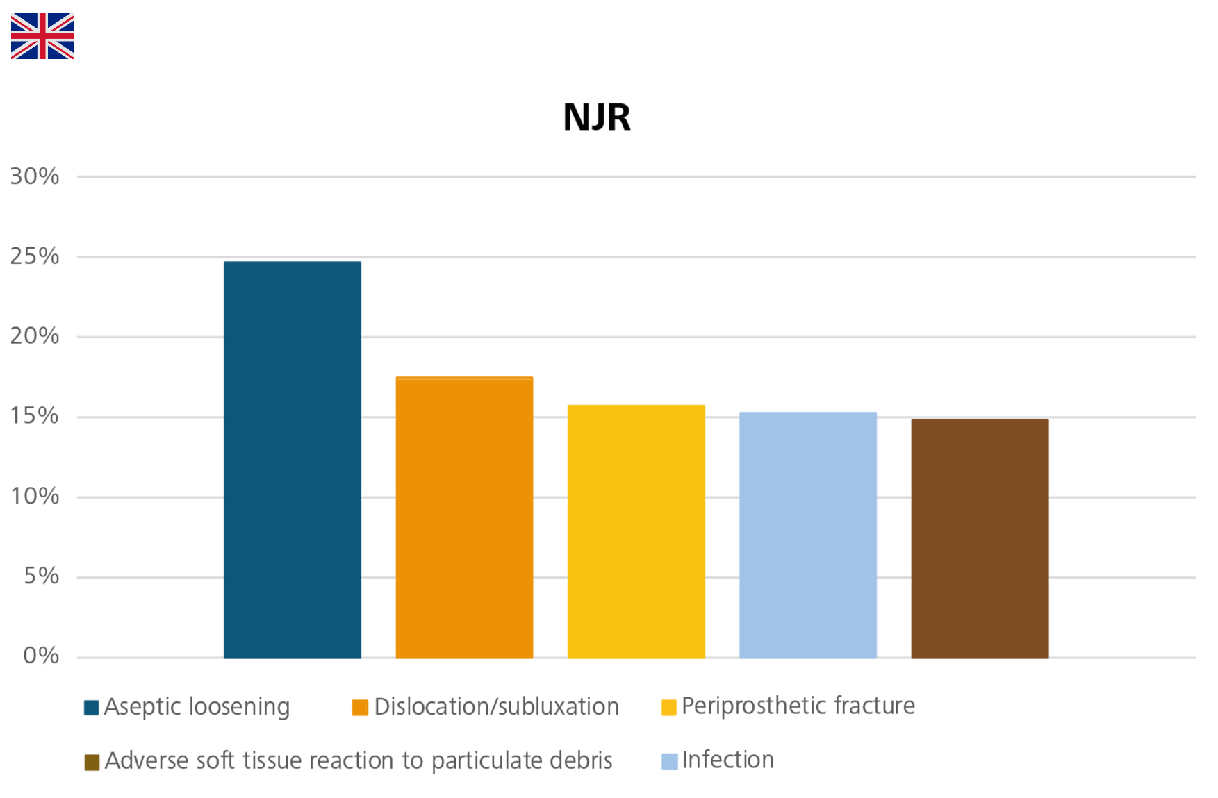 In the UK, 3% (40,387) of the 1,344,357 primary hip replacements recorded in the NJR Annual Report 2021 are associated with a first revision. The most common reasons for revision recorded by the NJR were aseptic loosening, dislocation/subluxation, periprosthetic fracture, infection, and adverse soft tissue reaction to particulate debris.1