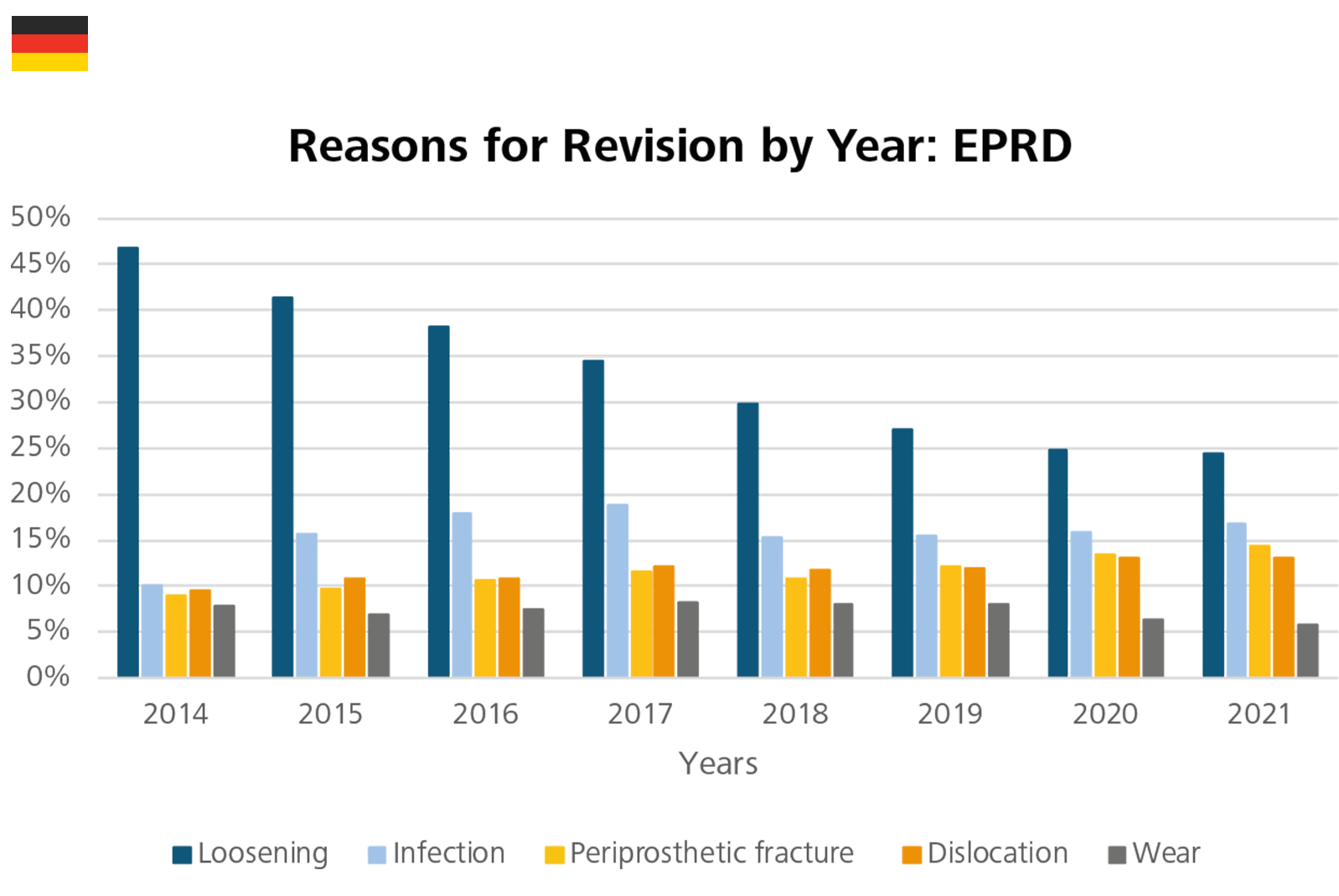 The German registry provides annual data on reasons for revision. In 2021, loosening (24.4%), infection (16.7%) and periprosthetic fracture (14.3%) were the most frequent causes for revision. The revision rate due to loosening has has decreased year on year. The rates for revision due to infection increased from 10% in 2014 to 18.9% in 2017, dropped off to 15.8% in 2020, then slightly increased to 16.7% in 2021.3,8-14