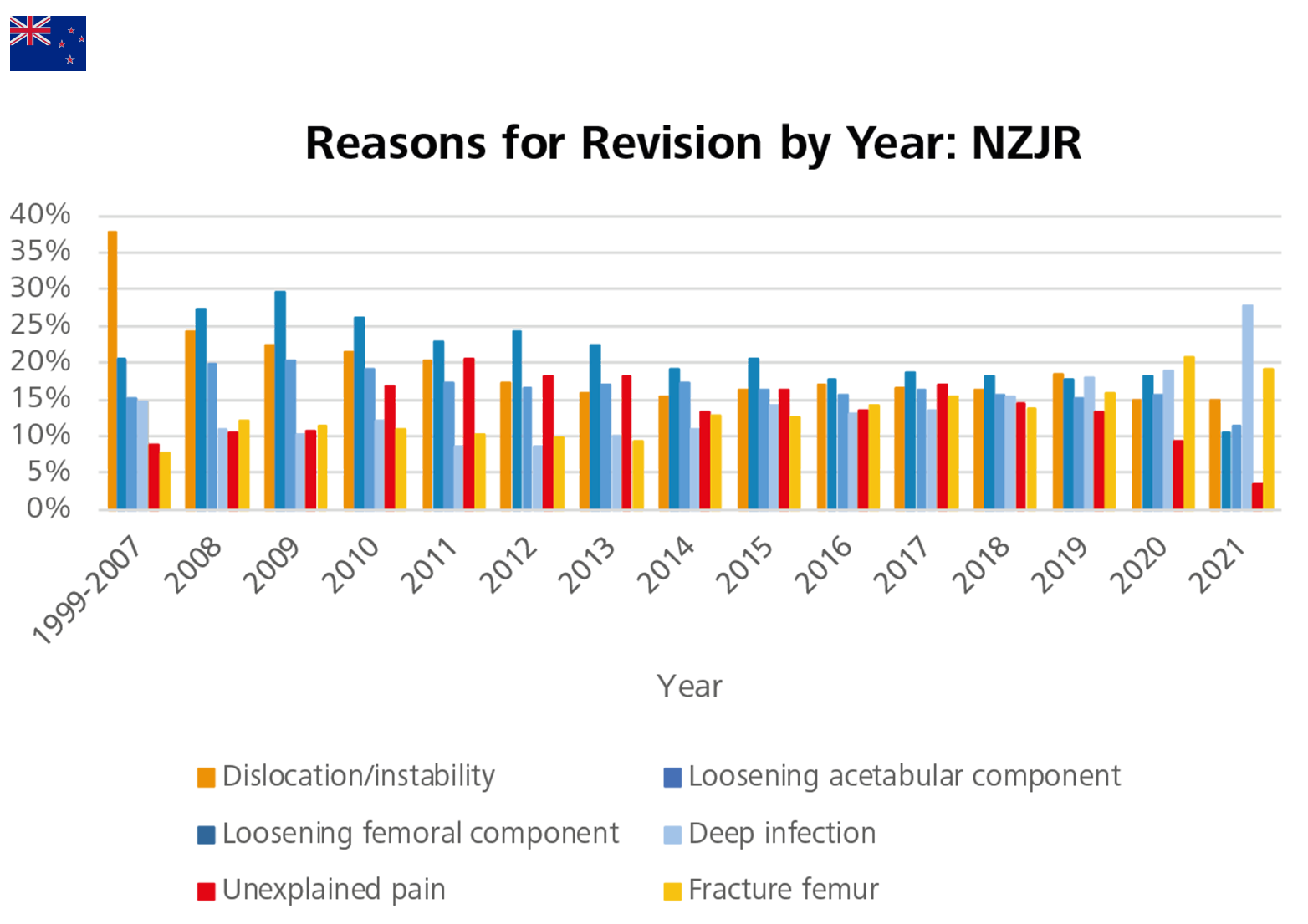 Since 1999, the six main reasons for revision after THR procedures in New Zealand are: loosening (of the acetabular and femoral component, respectively), dislocation/instability, unexplained pain, deep infection and femur fracture. Deep infection and dislocation more often happen within the first year after surgery. On the other end of the scale, loosening is a more common indication for revision beyond 10 years after surgery.5