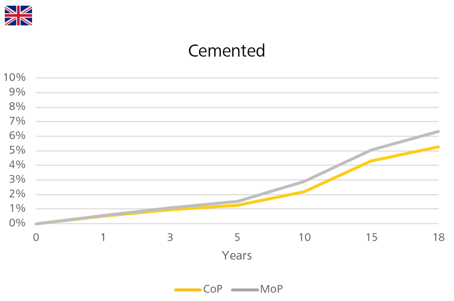 As the number of cases recorded by the NJR increases, the confidence intervals narrow and statistical significance is reached for both genders, in all age groups, and up to 18 years after implantation. This year the results obtained in younger patients with CoC, and CoP are statistically better than those obtained by MoP; the NJR 2022 Annual Report states that these results are “striking”.