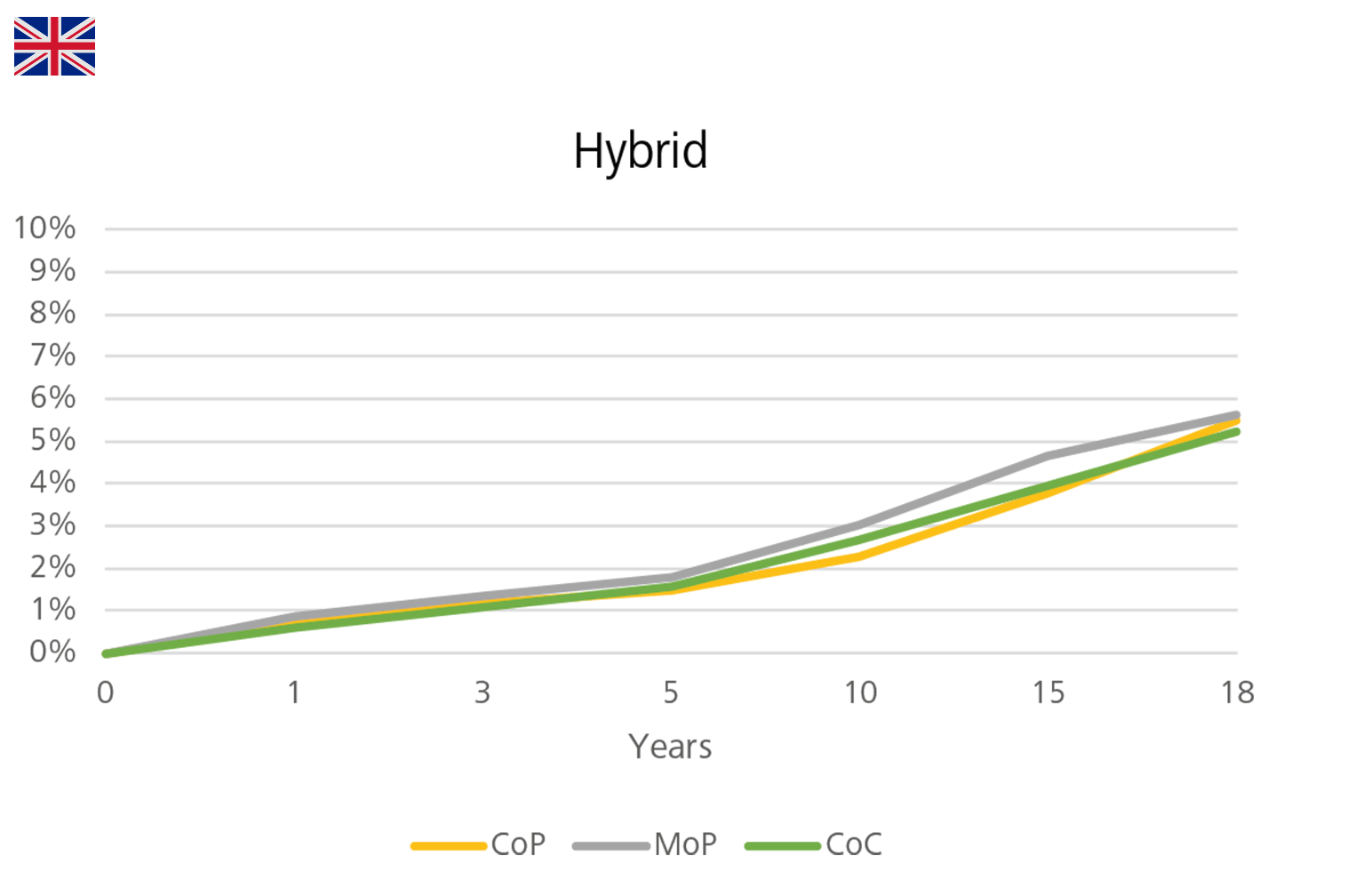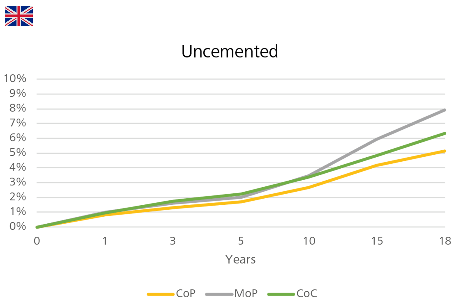 Figure 16: Cumulative revision rates in primary hip replacement with Mop, CoP, and CoC bearings in combination with different fixation methods in England, Wales, Northern Ireland, the Isle of Man and Guernsey.
