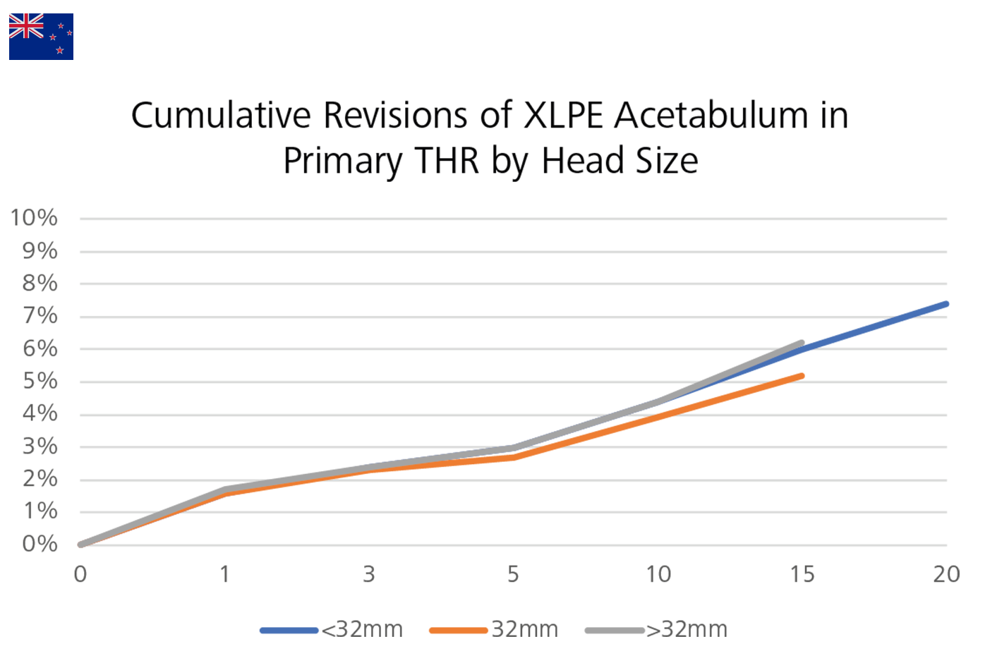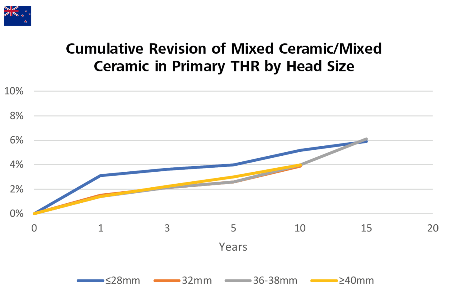 Regarding the head size group, in primary THR 32mm femoral heads show the lowest revision rates, followed by 36mm, then <=28mm heads.5