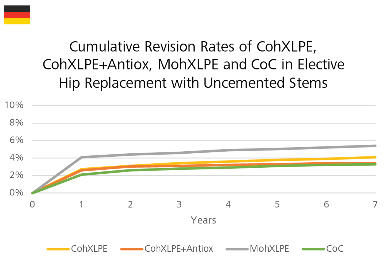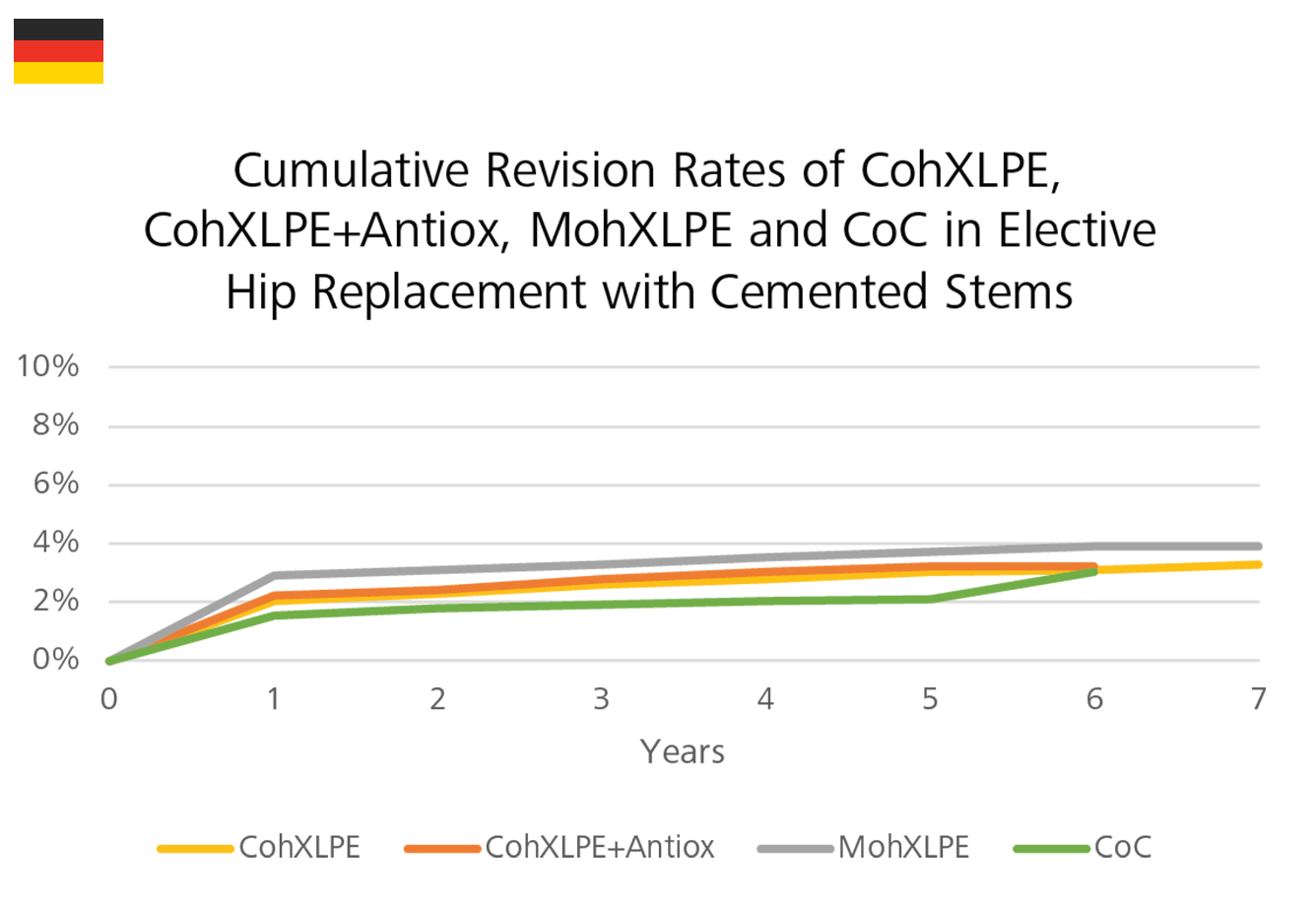 Figure 20: Cumulative revision rates of CohXLPE, CohXLPE+Antiox, MohXLPE and CoC in elective hip replacement by stem fixation in Germany.