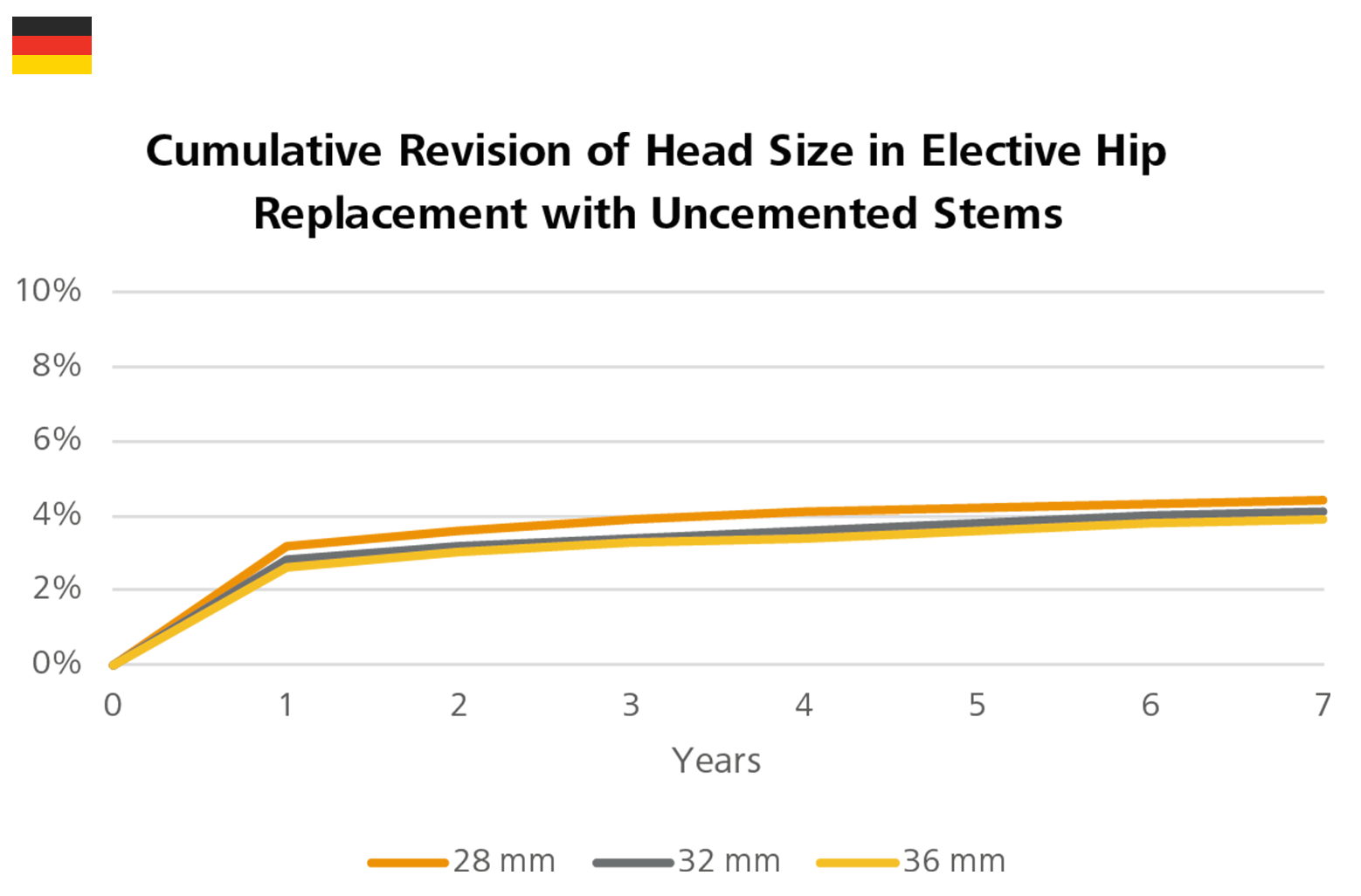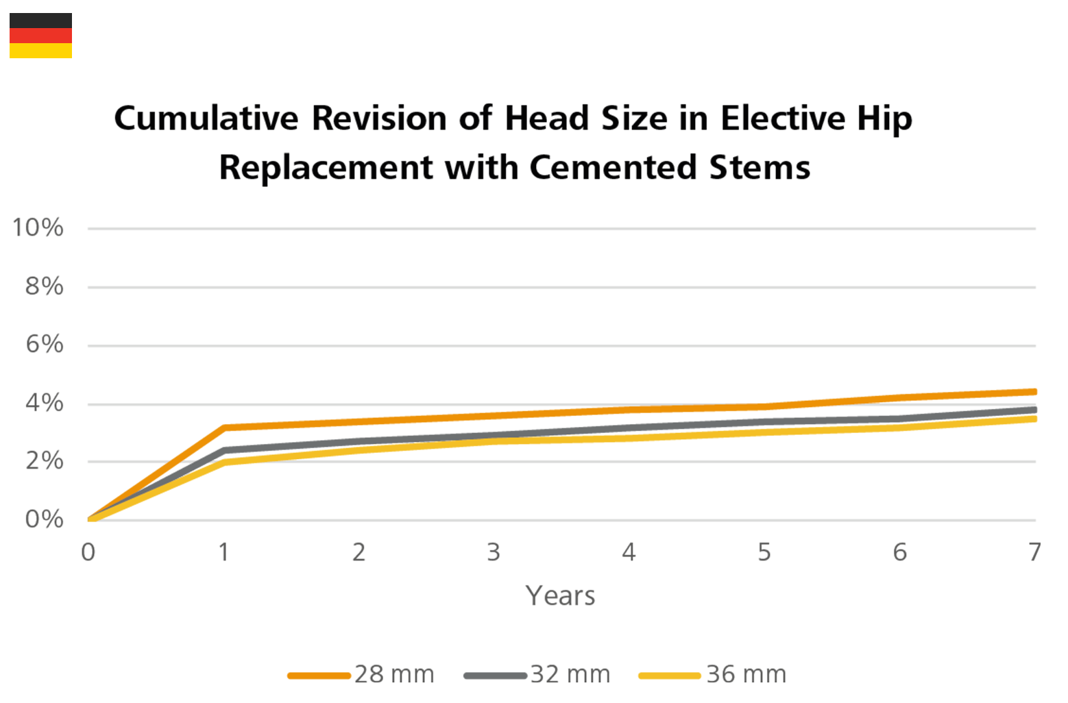 Figure 22: Cumulative revision rates of head size in elective hip replacement with different fixations in Germany.