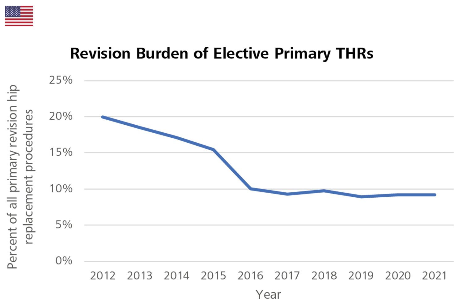 In the USA, 9.2% of all THR procedures were revisions. There was a steep decline of this number from 20% in 2012 to 10% in 2016, however since 2017, it has remained relatively stable. For male patients over 65 years old, cemented stem fixations show a higher cumulative revision rate than that of uncemented stem fixations. The opposite is true for female patients over 65 years old.4