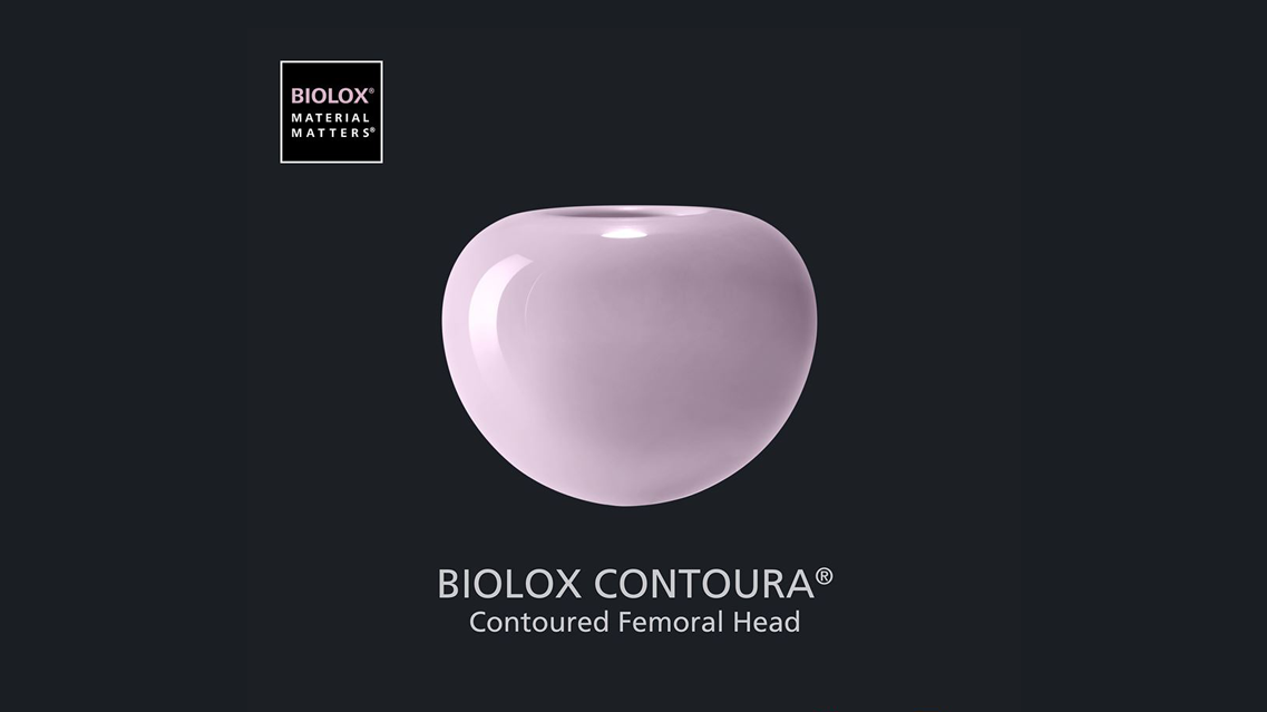 The BIOLOX CONTOURA® ceramic femoral head made of the pink BIOLOX®delta ceramic retains the outer diameter profile of a conventional implant and incorporates a contoured shoulder with a lesser radius.